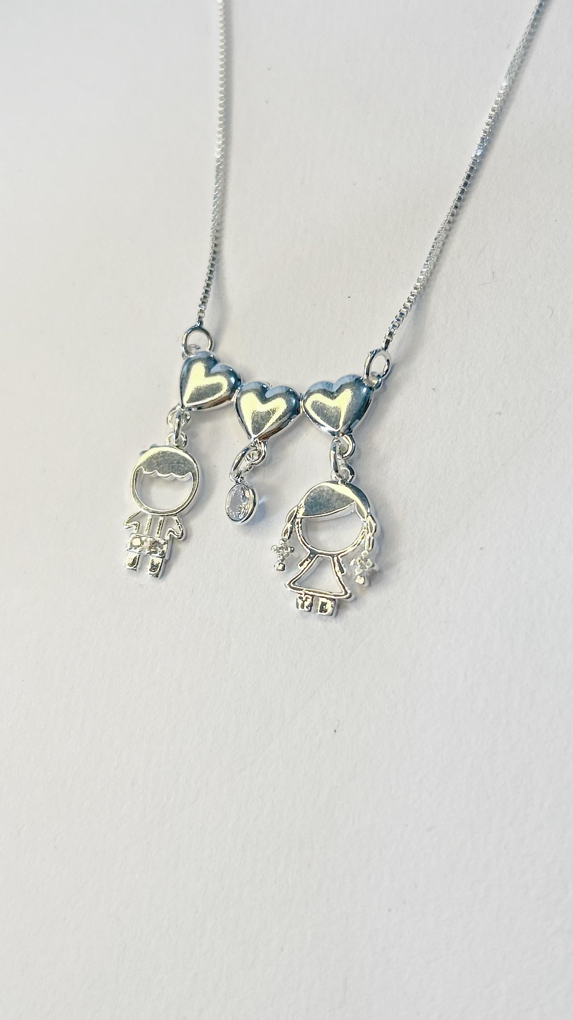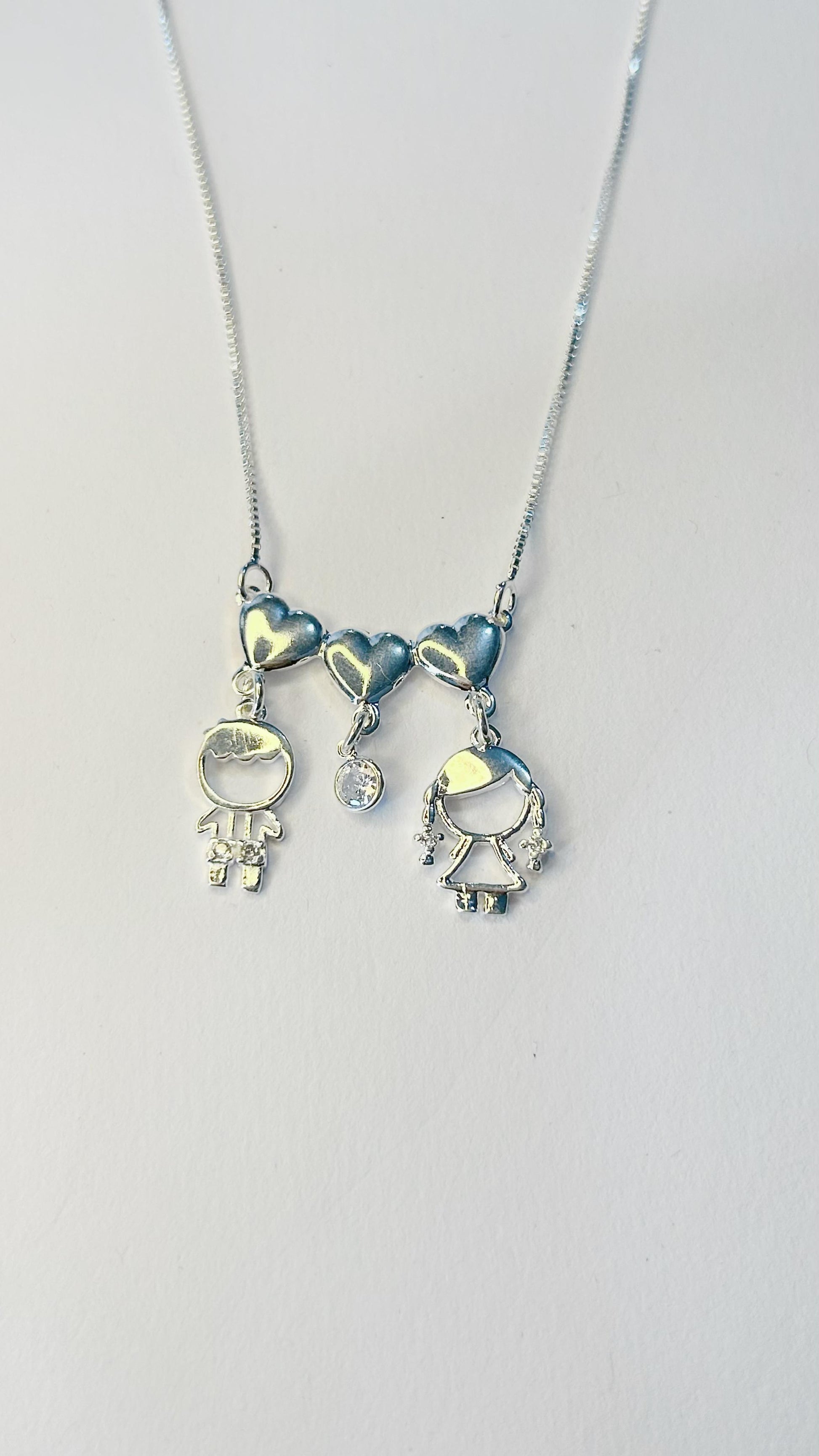 Um acessório delicado e cheio de significado. O design apresenta três corações entrelaçados, simbolizando amor e união, acompanhados de pingentes de menino e menina — perfeito para representar filhos, família ou pessoas especiais.