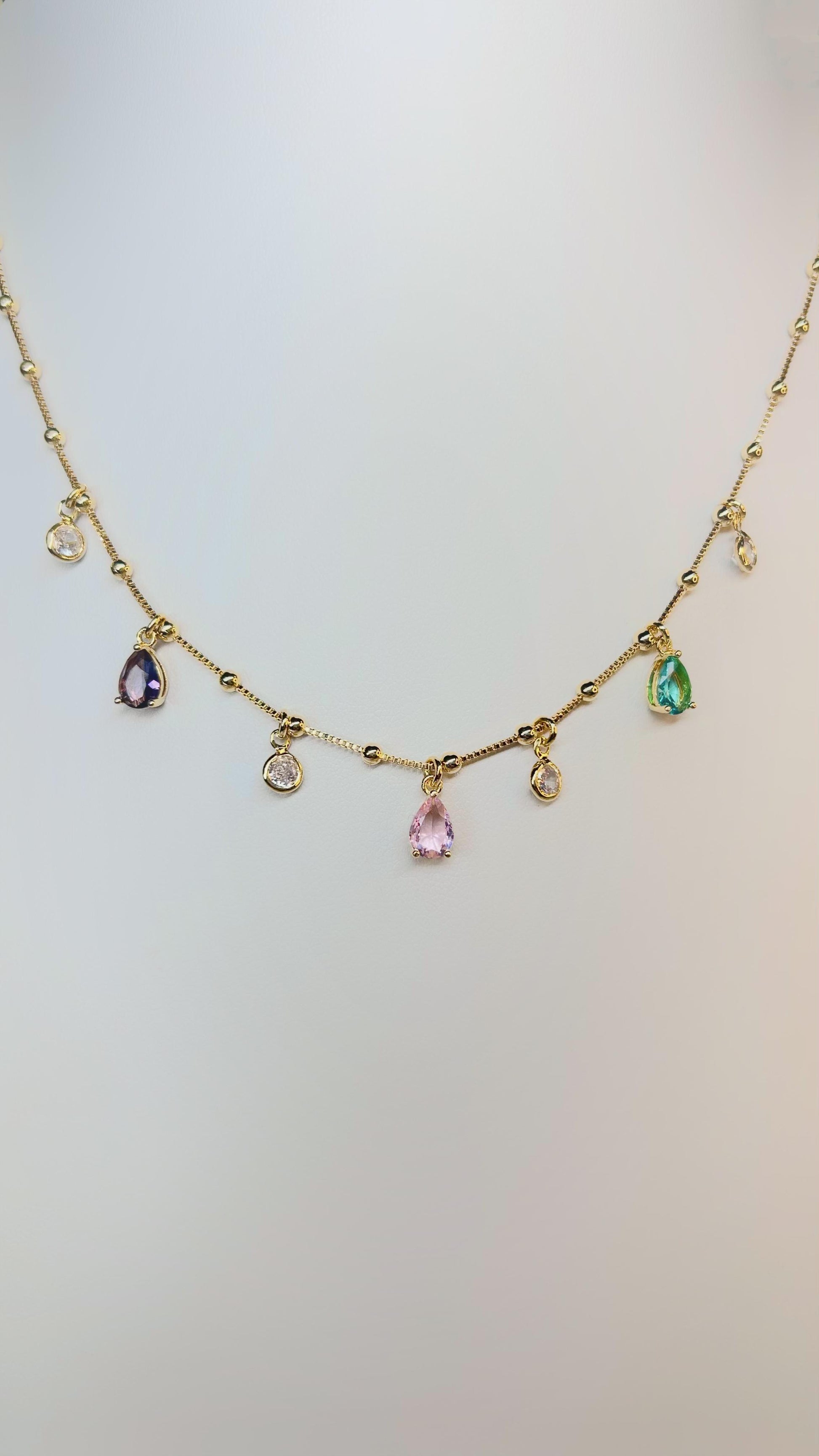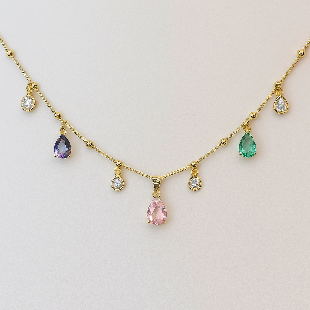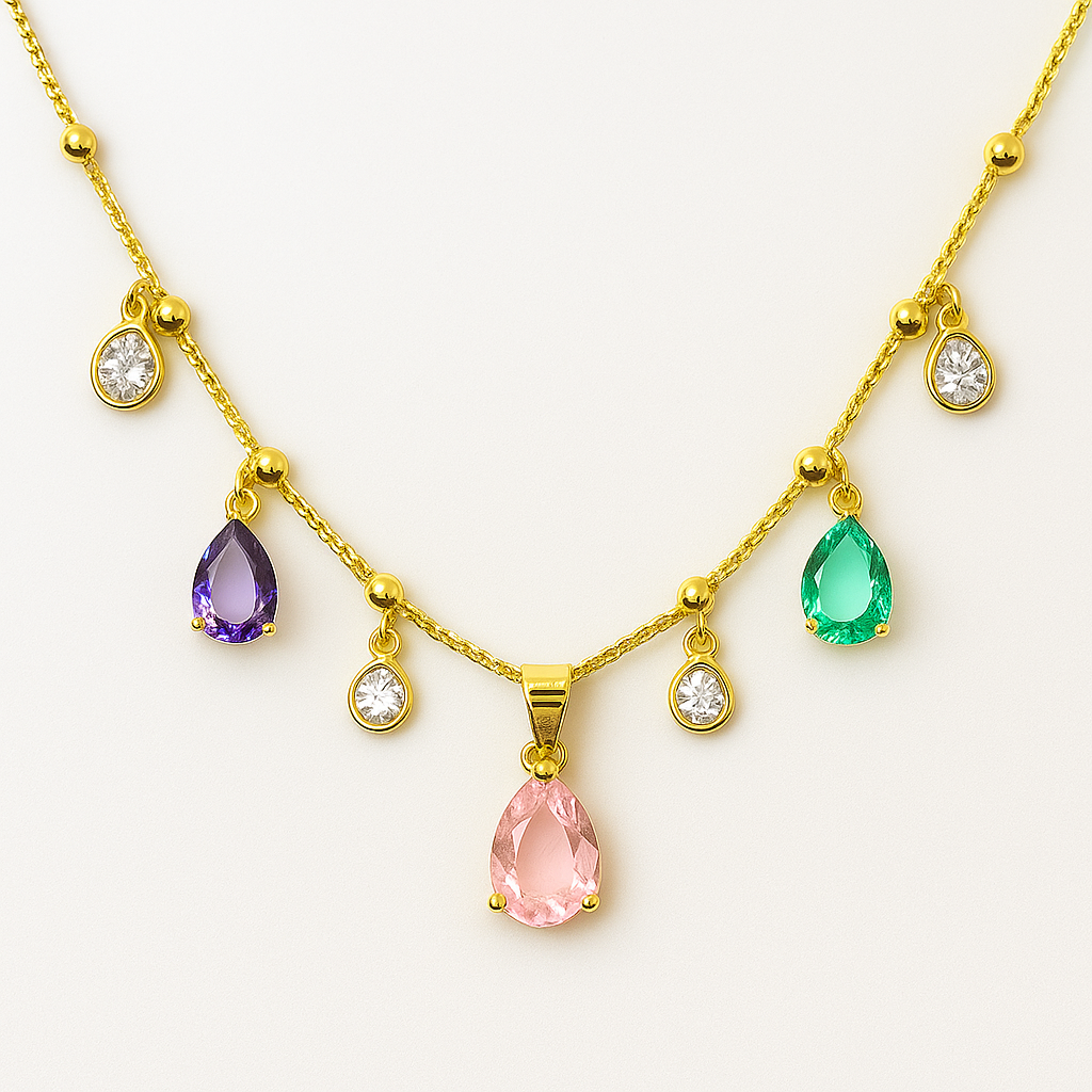Colar Dourado com Pingentes de Gotas Multicoloridas