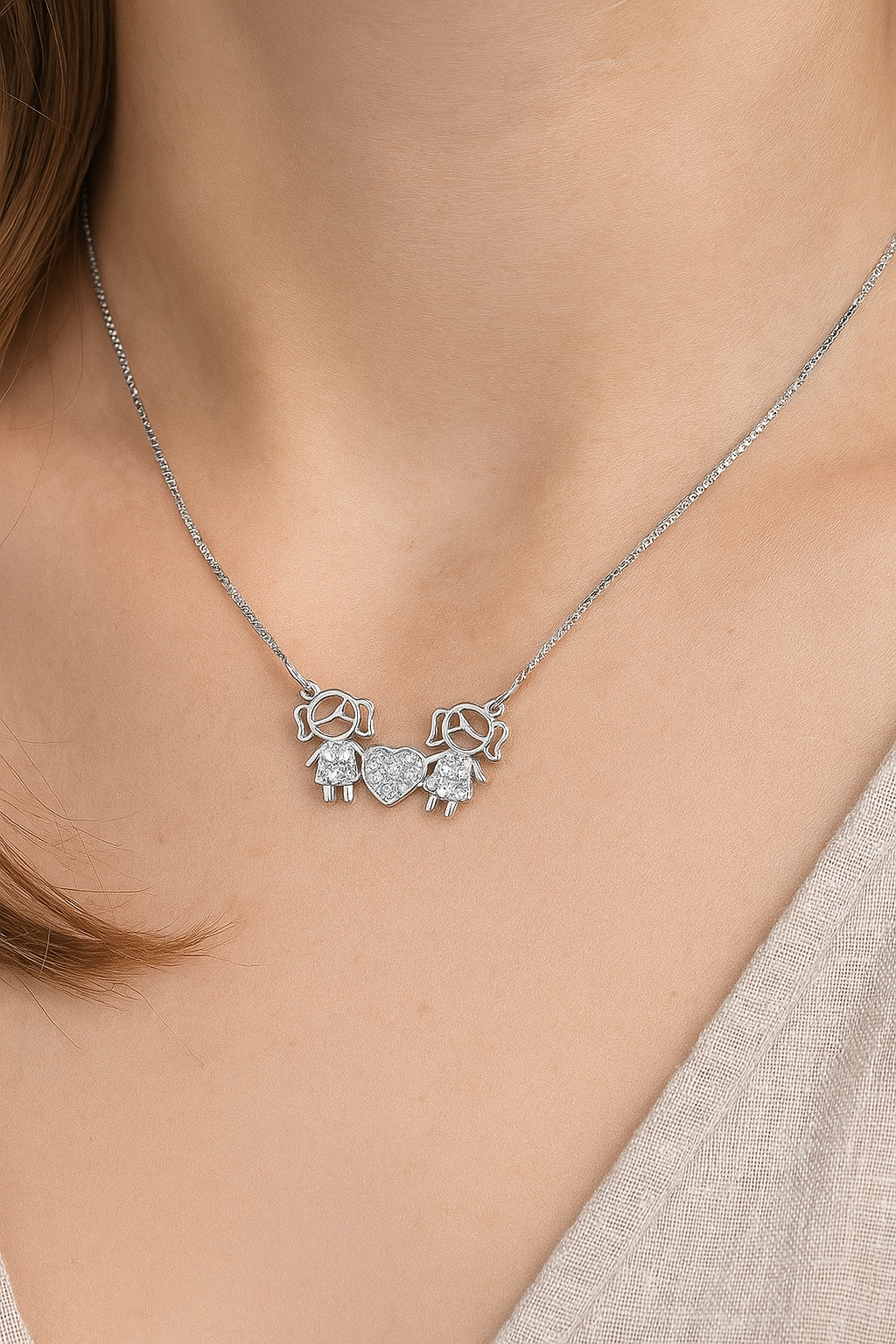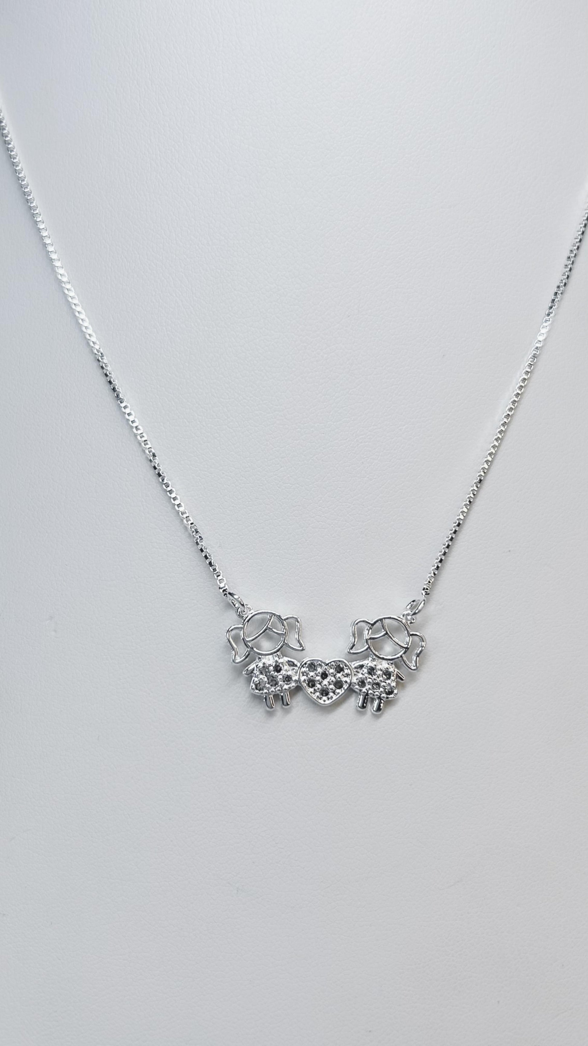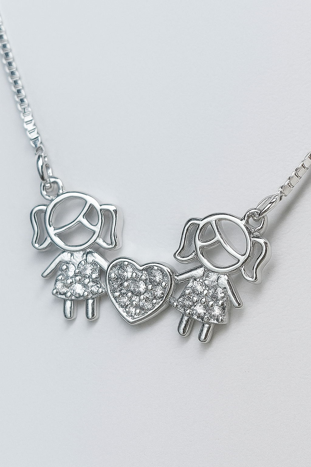 Colar Duas Filhas com Coração Cravejado em Prata – Amor de Mãe