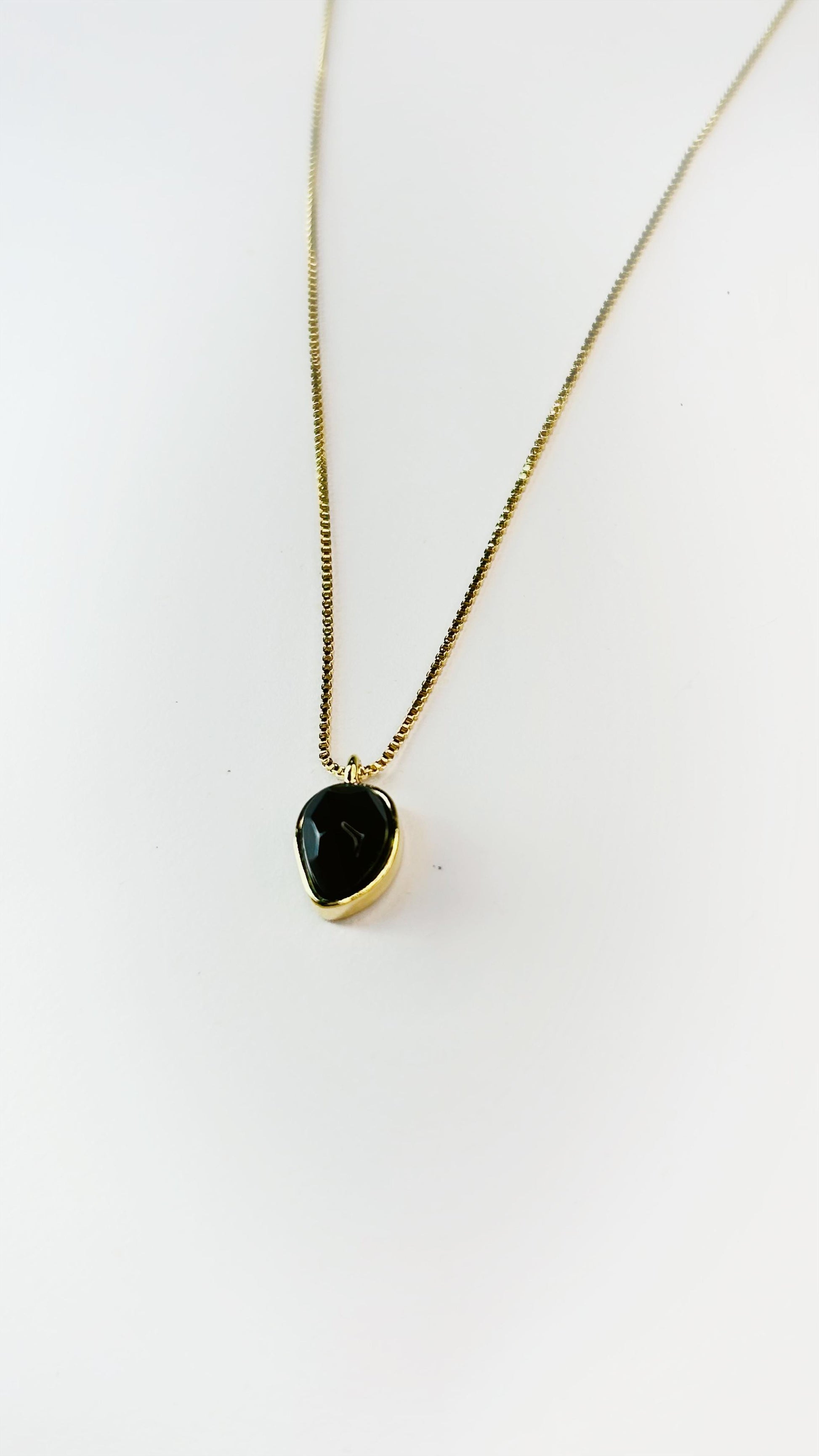 Elegância discreta e sofisticação atemporal em uma única peça. Este colar apresenta um pingente em formato de gota com pedra natural de ônix, envolto por um acabamento folheado a ouro 18k. Um acessório minimalista, versátil e cheio de personalidade — ideal para compor looks clássicos ou modernos.